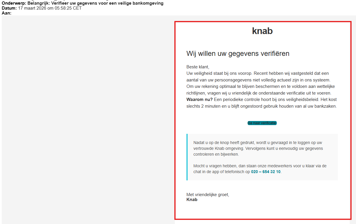 Dit is een phishingmail dat nu rondgaat 'uit naam van Knab'. Pas op! In deze valse e-mail vragen criminelen je om je telefoonnummer te verifiëren. Doe je dat, dan krijgen criminelen toegang tot je bankgegevens.
