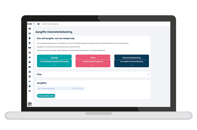 Werk je met een boekhoudpakket zoals dat van Knab? Dan verstuur je je aangifte inkomstenbelasting eenvoudig rechtstreeks vanuit je administratie. Alle relevante gegevens staan al klaar, dus je hoeft niets over te typen. Dat bespaart tijd, verkleint de kans op fouten en je weet zeker dat je werkt met de juiste cijfers.